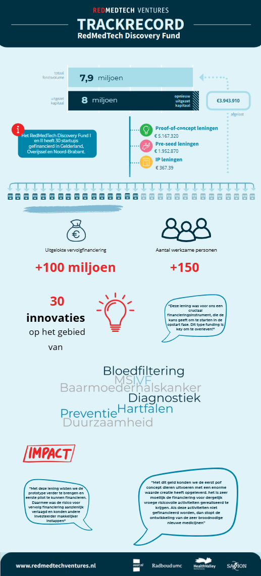 Na succesvolle funding rondes komt er geen nieuwe ronde van het RedMedTech Discovery Fund. Het beheer van de leningen is overgedragen aan Oost NL. Per december 2025 zijn alle leningen overgedragen naar Start Up Fonds Gelderland. Vanuit daar zullen start ups in het life sciences en health domein gefinancieerd worden.